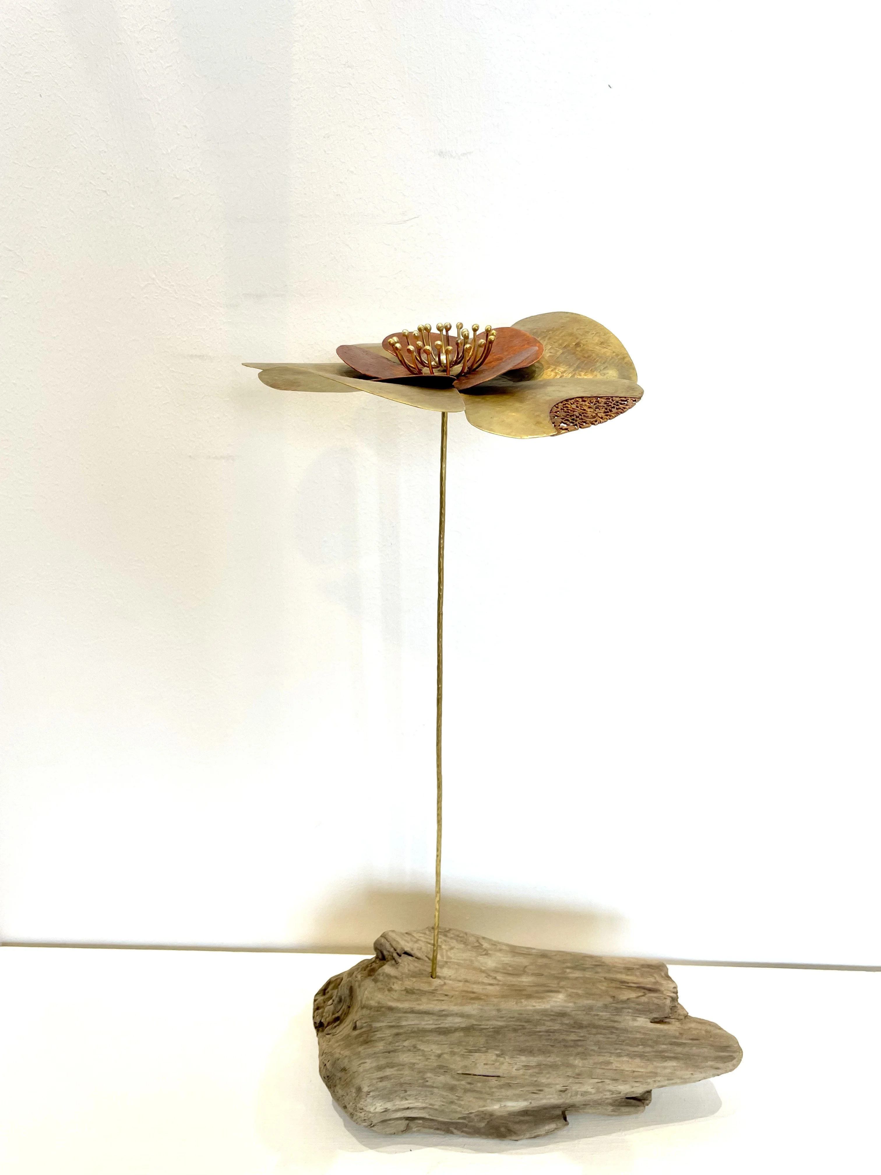 Laiton, Cuivre, Bois flotté ( Haut: 50 cm. Larg: 28 cm. Diamètre fleur: 19 cm)
